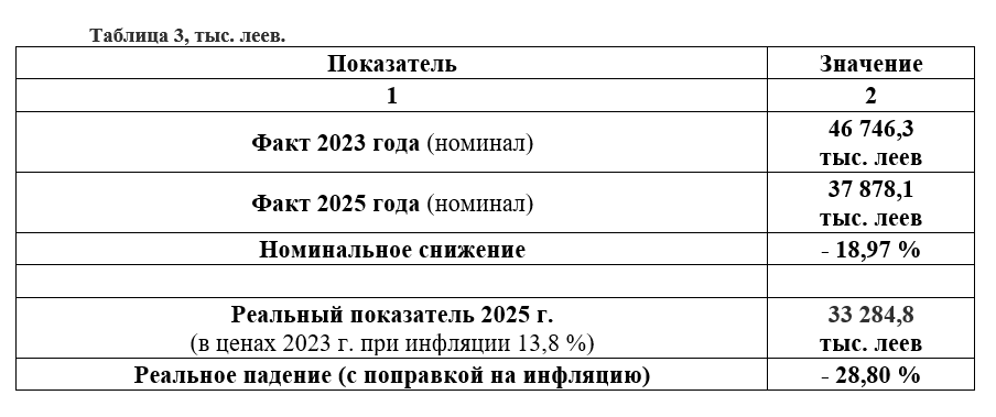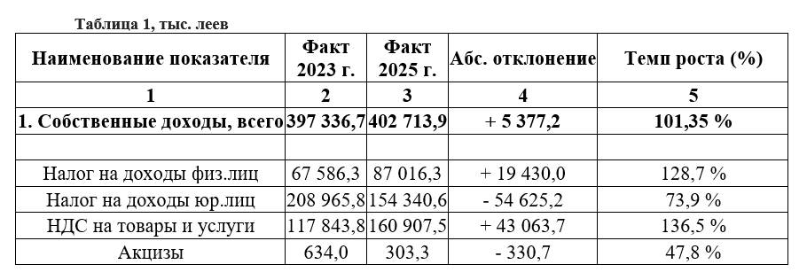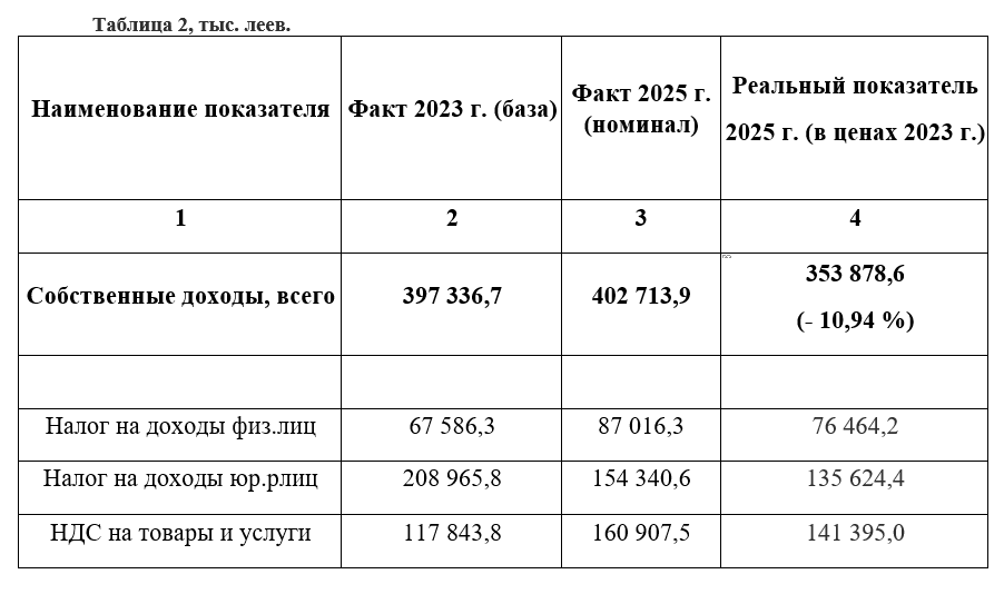 Если мы в анализ добавим совокупный индекс инфляции, который составил за 2024-2025 гг. в Республике Молдова - 13,8 %, то сравнение собственных доходов за 2023 и 2025 год, будет выглядеть следующим образом.